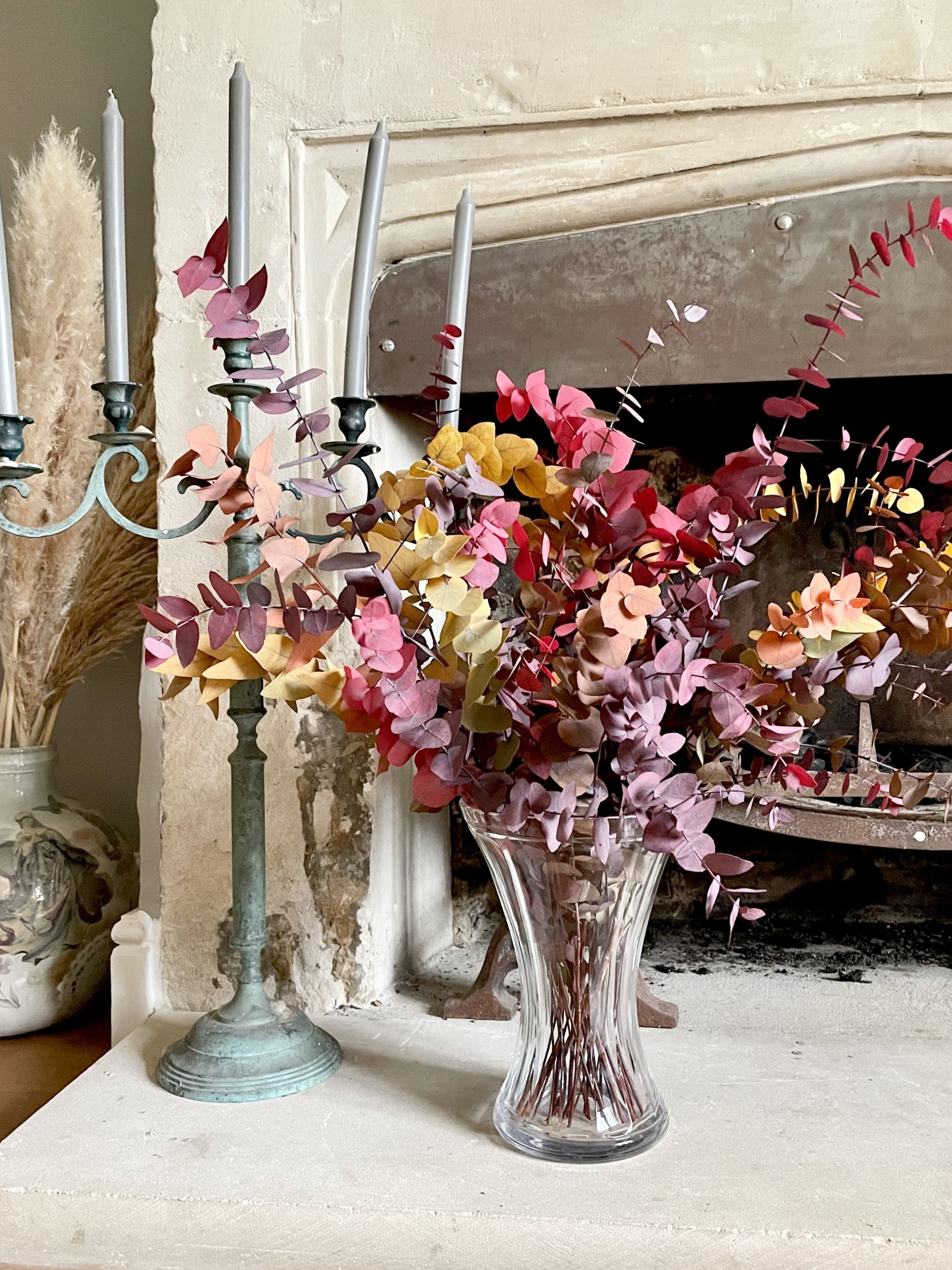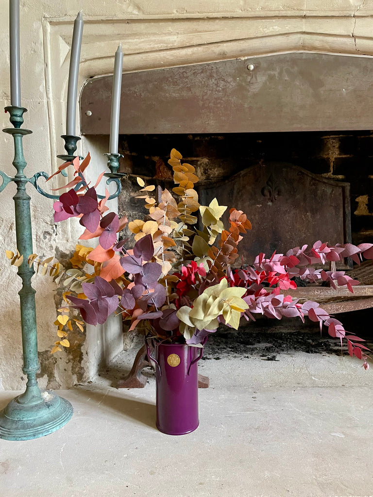 Bring the warmth of autumn into your home with this autumnal dried eucalyptus arrangement in bold Halloween colours. Featuring a striking mix of deep burgundy, fiery red, burnt orange, and golden yellow tones, this statement piece is perfect for creating a seasonal centrepiece that lasts well beyond Halloween.